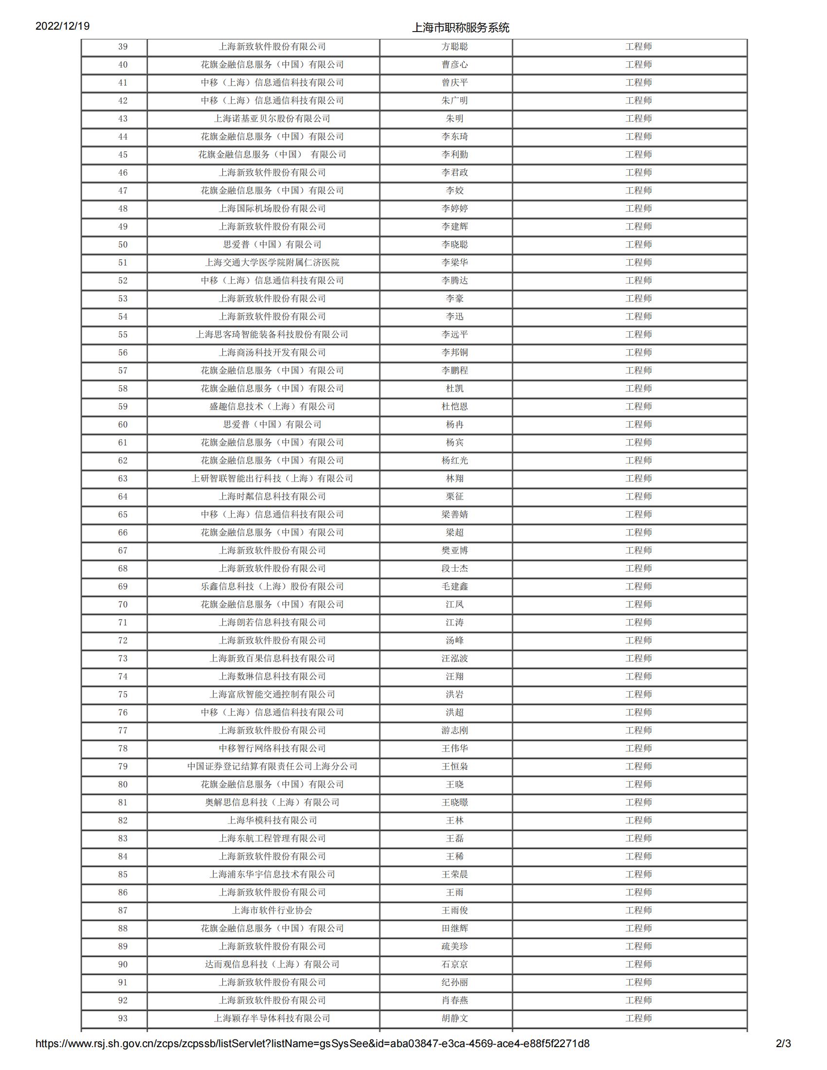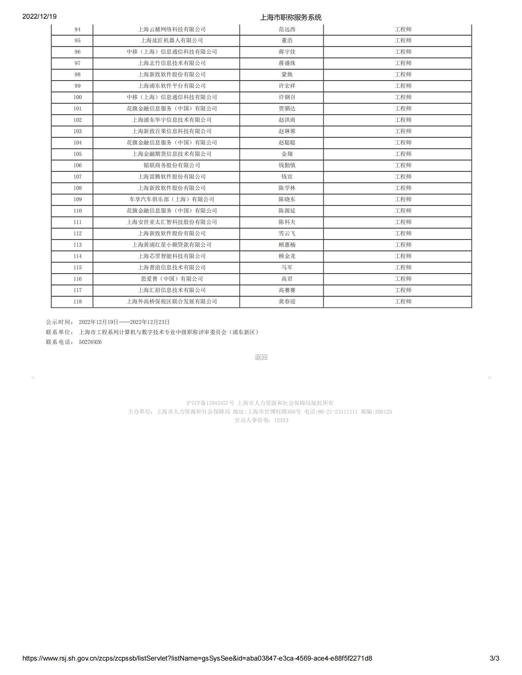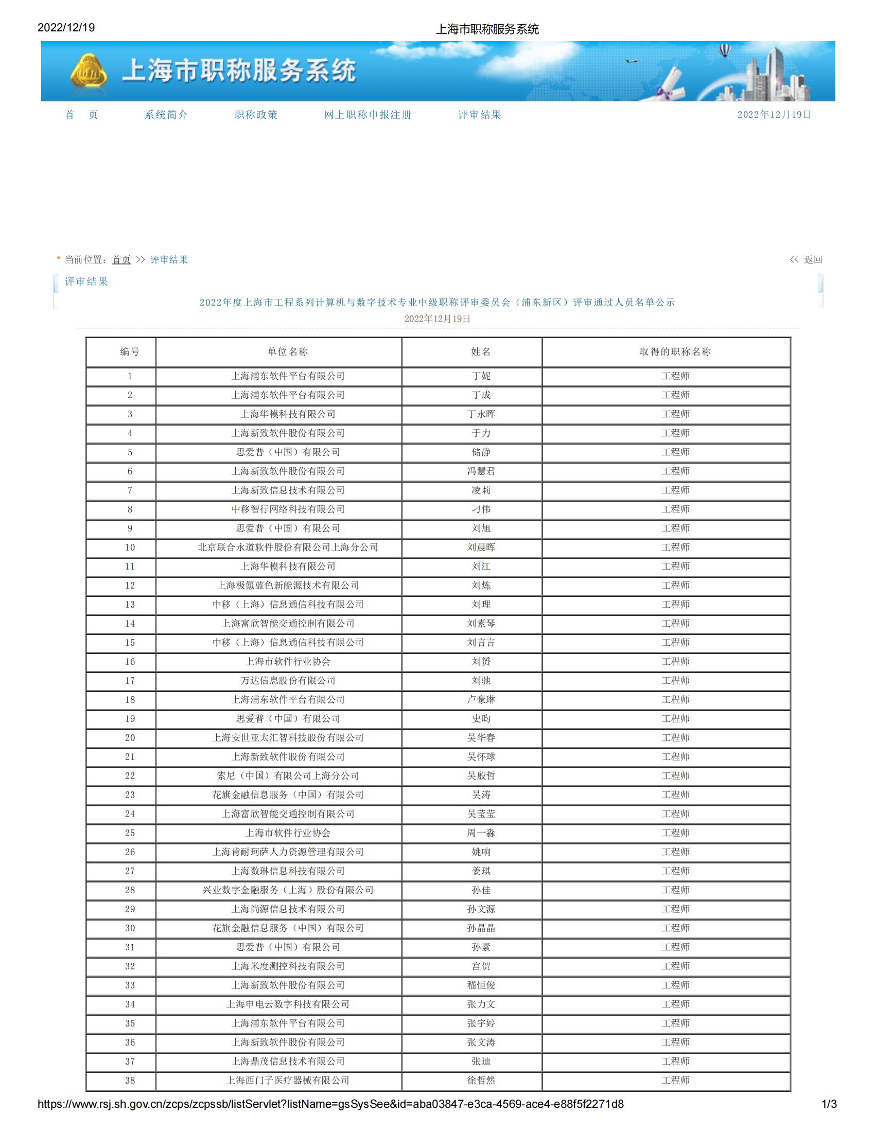 2022年度上海市工程系列計算機與數字技術專業中級職稱評審委員會(浦東新區)評審通過人員名單公示